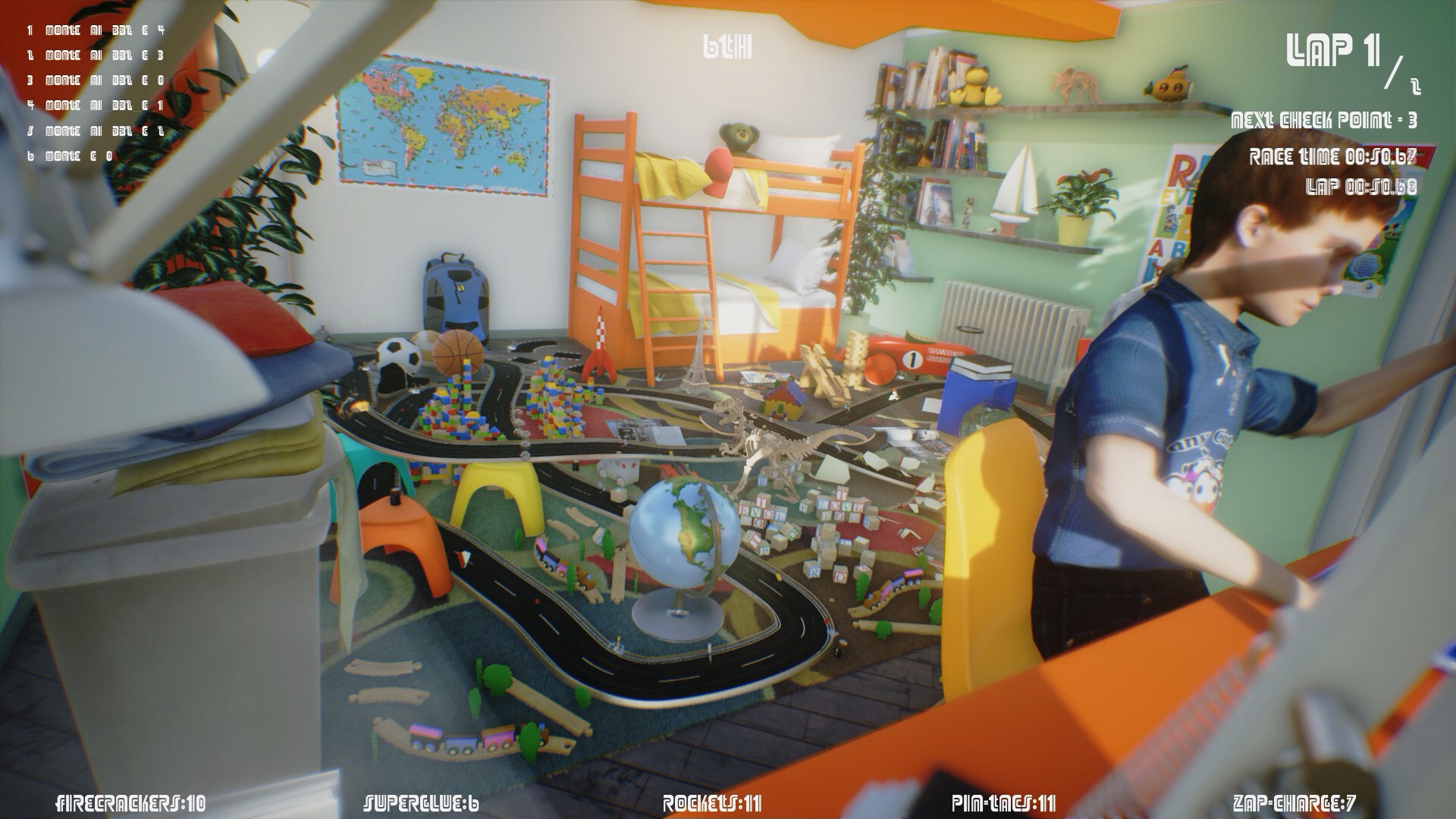 Race around many variations of the tracks inside and outside of the family house. The tracks are filled with real-life weaponry that you can use against your opponents; Classic weapons like firecrackers, fireworks, pintacks or even superglue (that instantly stops players since the car have nearly no weight).